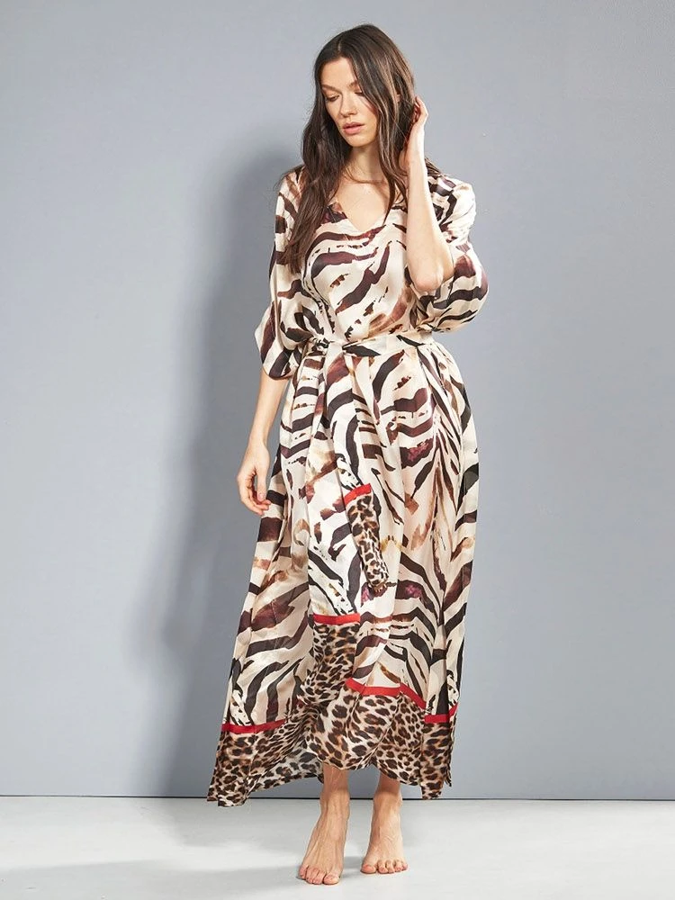 Langer Seiden Kaftan mit einer Neuinterpretation von Animal Print. Das verfremdete Zebramuster ist als platzierter Druck auf einem Seidensatin aus 100% Seide ausgeführt, wodurch dieser Seidenkaftan besonders edel wirkt. Der Kaftan hat einen V-Ausschnitt und kann mit dem zugehörigen Bindegürtel zu einem bequemen Hauskleid oder Sommerkleid drapiert werden.