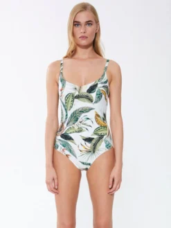 Der Badeanzug ist auf der Vorderseite innen gefüttert und hat einen elastischen Gürtel mit Schnalle.