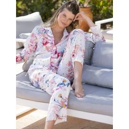Der Schlafanzug weiß mit rosa und blauem Druck ist feminin geschnitten und mit einer pink-farbenen Biese verarbeitet. Er ist in den Größen 36 bis 44 erhältlich (deutsche Damen-Größen). Aus der gleichen Kollektion gibt es bei uns separat einen passenden Hausmantel.
