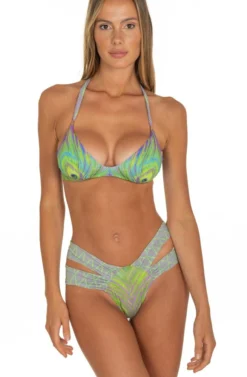 Die 3/4 Schalen Cups sind nicht wattiert und mit Bügel – sie passen am Besten für kleine Cups. Auf der Rückseite und im Nacken wird das Oberteil gebunden. Der knappe Slip hat seitliche Bändchen, die verstellbar sind.