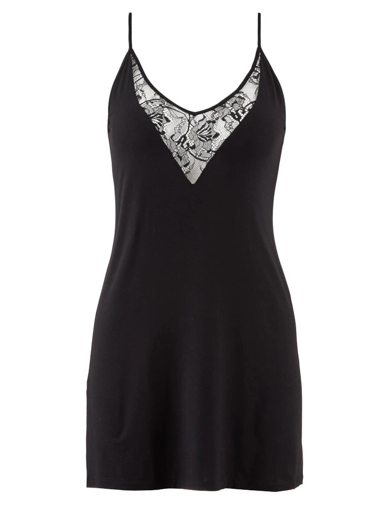 Das elegante Nachtkleid hat einen tiefen V-Ausschnitt, welcher durch einen transparenten Spitzeneinsatz stilvoll die Haut enthüllt. Die feinen Spaghettiträger, sowie der tiefe Rückenausschnitt verhleihen dem Nachthemd eine elegante Zartheit. In Kombination mit der floralen Spitze am Ausschnitt und dem hochwertigen Stoff wird ein Negligé geschaffen, welches sowohl komfortabel, als auch verführerisch ist.
