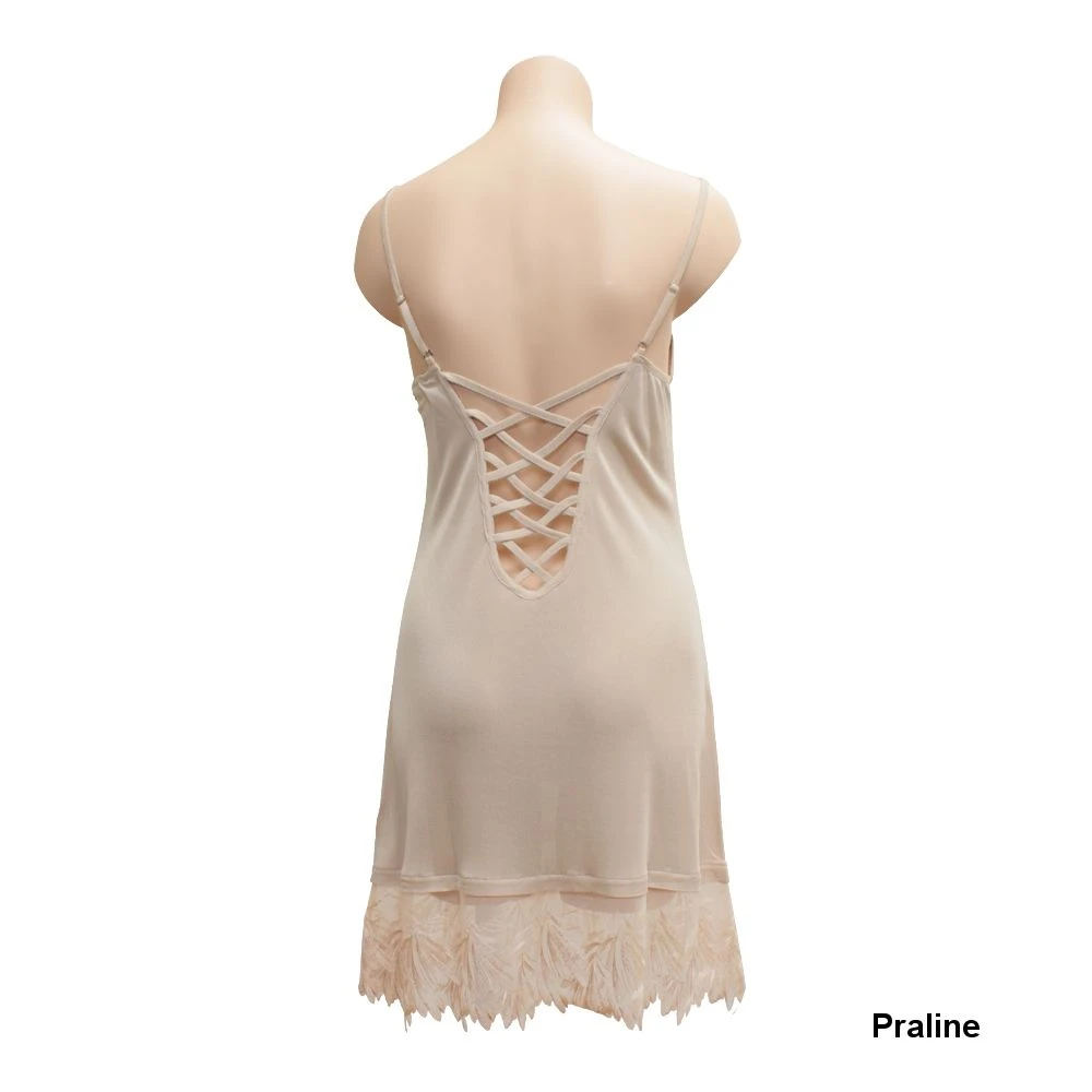 Dieses Spaghetti-Träger Nachthemd aus reiner Seide gibt in zeitlosem Schwarz oder in dem Hautton „Praline“. Das kurze Nachthemd hat verstellbare feine Spaghetti- Träger und einen Rückenausschnitt mit Schnürlook-Einsatz (fest genäht, nicht verstellbar). Der untere Saum ist mit einer breiten, bestickten Spitze besetzt. Die Länge ist ca. 88 cm. Es kann als Nachthemd oder Unterkleid verwendet werden.