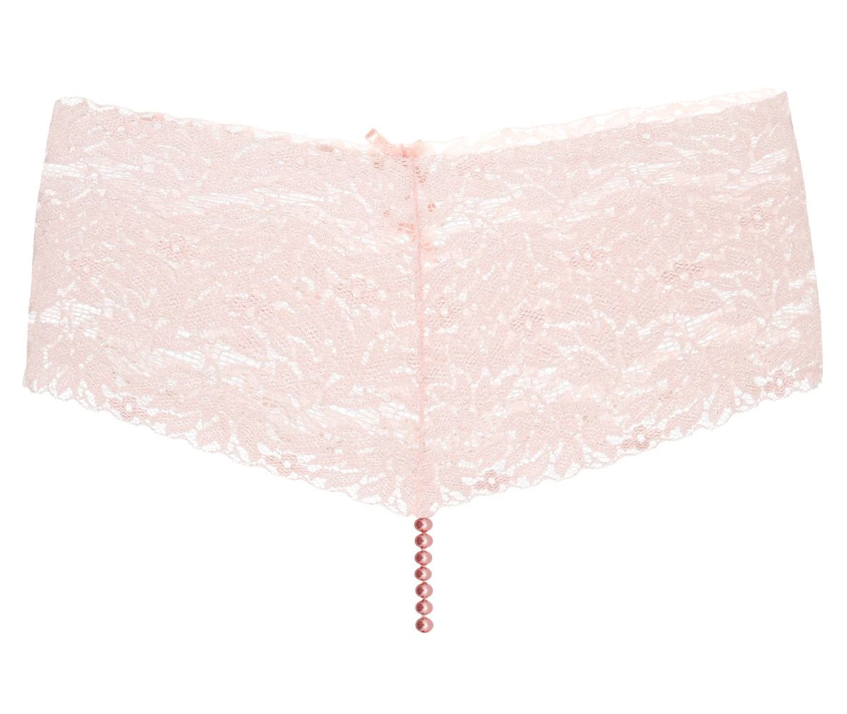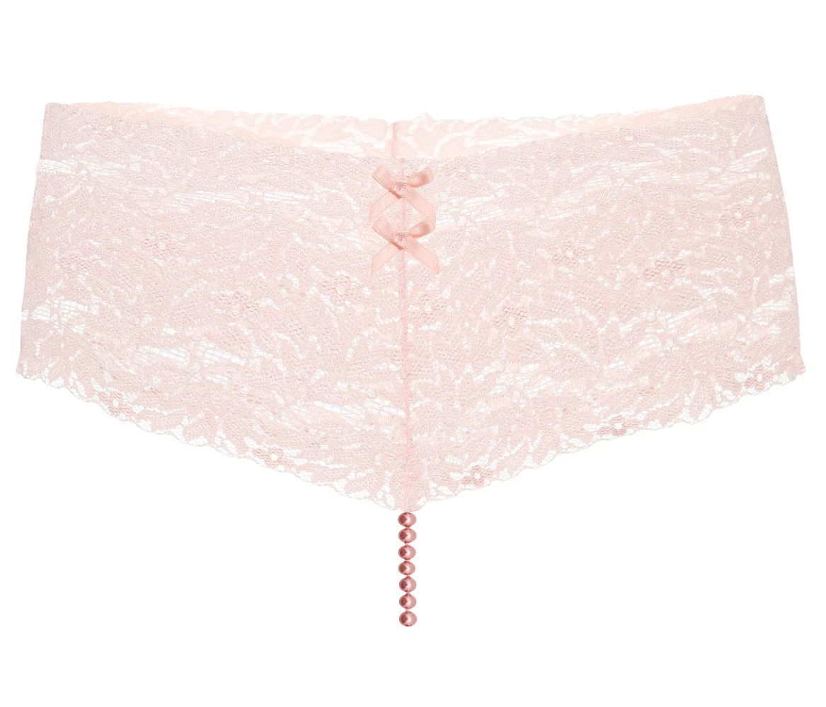 Der Perlenstring Hipnosis ist aus einer breiten, elastischen Spitze in Boy-Short Form mit einer einreihigen Perlenkette im Schritt gestaltet. Der Clou ist: bei diesem String sind die Perlen, farblich passend zur Spitze rosa eingefärbt! Die hochwertigen, edel schimmernden Manacor Perlen verleihen dieser Wäsche einen besonders femininen Look. Durch die umlaufend breite Spitze wirkt dieser Perlenstring sehr jung und schmeichelt auch Frauen mit weiblichen Rundungen.