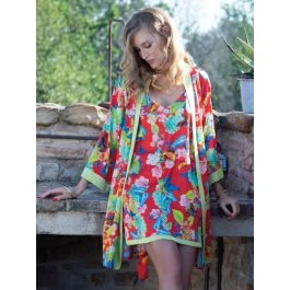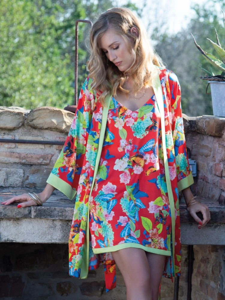 Dieser exclusive Kimono hat einen farbenfrohen Print von bunten Blumen und Schmetterlingen auf cremeweißem oder rotem Grund mit apfelgrünen Details. Das Material ist fein und glänzend.