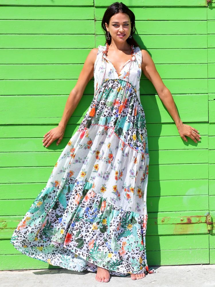 Das lange Strandkleid Fantasia Bianco der italienischen Luxus-Marke Laetitia Beachwear ist aus feinem Seidenbatist (65% Baumwolle, 35 % Seide) gefertigt. Das exklusive Kleid ist in einem Mustermix mit floralen und Animal Print Mustern gearbeitet und in echter Handarbeit mit Häkelsäumen verziert. Der Ausschnitt ist umhäkelt mit eingearbeiteten Zierperlen und hat vorne ein Kordelbändchen zum Binden, welches in fransigen Quasten endet.