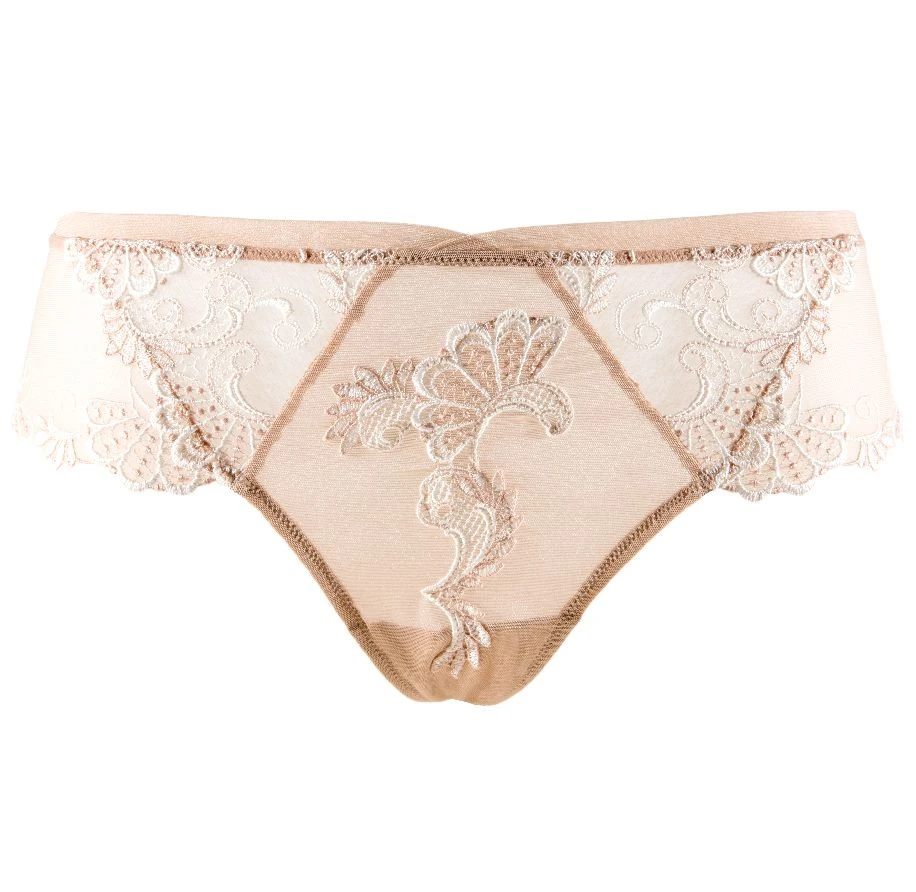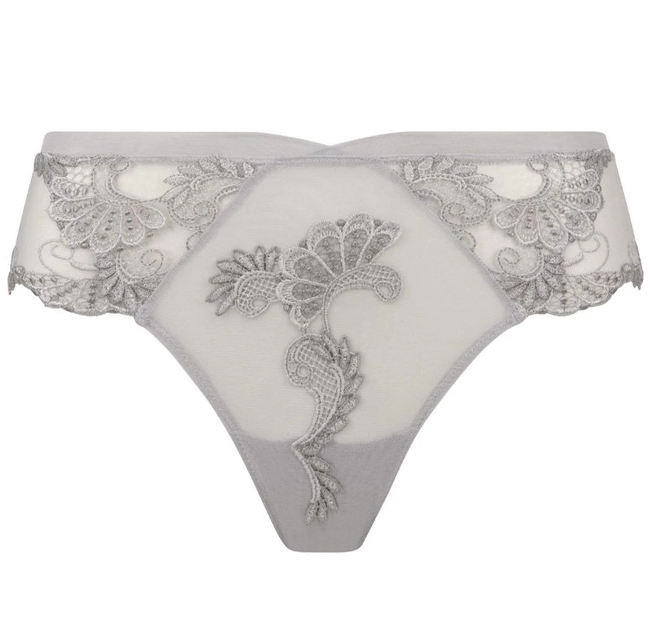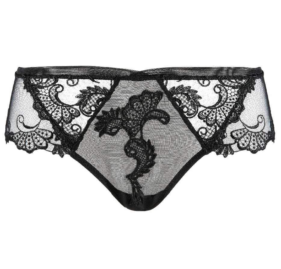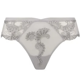Der Slip ist komplett aus teiltransparentem Tüll, verziert mit floralen Guipure-Stickereien. An den Seiten ist der Slip mit super feinem Tüll versehen, welcher in Kombination mit den zarten Stickereien einen leichten Tatttooeffekt erzeugt. Die Hinterseite des Pantys ist komplett aus transparentem Tüll, welcher nur an den Seiten mit den feinen Stickereien versehen ist. Zusätzlich schmückt ein kleines Zierschleifchen die Rückseite. Im Schritt hat der raffinierte Slip einen weichen Baumwollzwickel. Dieses detailreiche Zusammenspiel der unterschiedlichen Materialien und Akzente formt sich zu einem aufregenden Wäscheslip. Aus dieser zarten Kollektion gibt es viele weitere ergänzende Kombinationsteile seperat in unserem Shop.