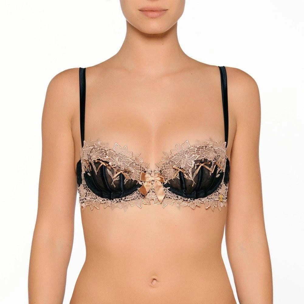 Der Balconette BH Desir ist eine luxuriöse Lingerie aus Spitze und Pünktchen-Tüll der französischen Edel-Dessous Marke Millesia. Der BH hat leicht ausgeformte, ungefütterte Halbschalen-Cups. Die Cups mit Bügel sind aus gepunktetem Tüll gefertigt, welcher mit exquisiter, Guipure Blütenspitze benäht ist.
