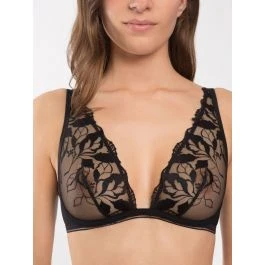 Der Triangel BH Sin ist eine luxuriöse Lingerie der französischen Edel-Dessous Marke Maison Lejaby. Der BH hat Cups in Triangel Form, die bei dieser Marke als Vollschale bezeichnet werden. Die Cups mit Bügel sind aus bestickter Tüll-Spitze mit floralen Motiven gearbeitet. Die Cups sind ungefüttert und transparent.
