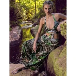 Weite Strandhose mit modischem Dschungel-Print mit Animalmotiven und Palmenblättern in grün. Das Muster ergänzt harmonisch Bademode in den Farben Braun oder schwarz. Die Hose ist bequem geschnitten mit elastischem Bund aus Feinjersey und weiten Beinen. Sie ist aus schnell trocknendem Satin hergestellt und ergänzt modische Bademode.