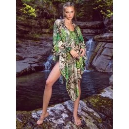 Knielange Strandtunika mit modischem Dschungel-Print mit Animalmotiven und Palmenblättern in grün. Das Muster ergänzt harmonisch Bademode in den Farben Braun oder schwarz. Die Tunika ist als quadratisches Tuch mit Halsausschnitt gearbeitet, was für einen leicht assymetrischen Look sorgt. Dieses Strandkleid ist mit ca. 90 cm Gesamtlänge knapp knielang. Die Tunika ist aus schnell trocknendem Satin hergestellt und ergänzt modische Bademode.