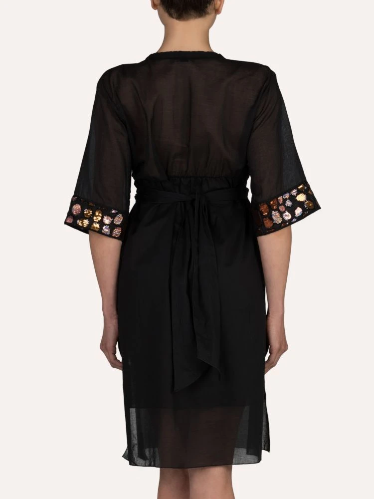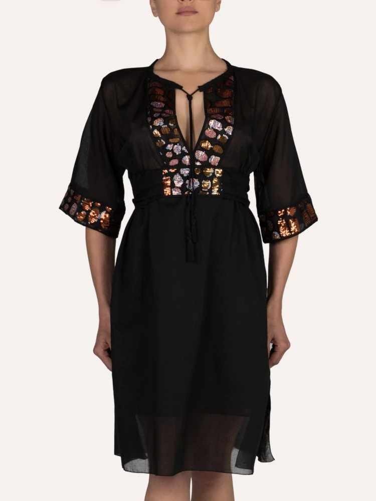 Das kurze Kleid ist gerade geschnitten und hat halb lange Ärmel. Teilweise ist der Stoff doppellagig gearbeitet um die Blickdichtigkeit zu verbessern. Vorne und an den Ärmelenden hat der Kaftan Auflagen von Pailletten in rose. Der Strandkaftan hat eine Schärpe, die wie ein Gürtel gebunden wird – so kann das Kleid tailliert werden. Der V-förmige Ausschnitt hat ein Bindebändchen.