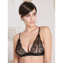 Der Triangel BH besteht aus transparenter Tüllspitze in Kombination mit glänzendem Satin. Dieser zierliche BH hat verstellbare Träger und wird hinten mit einem 3-fach verstellbaren doppeltem Häkchenverschluss geschlossen. Der BH ist transparent, bügellos und nicht abgefüttert.