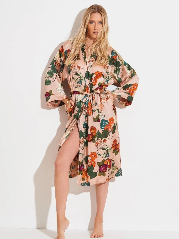 Morgenmantel Flowers rosa grün aus Viscose Satin von Chiara Fiorini
